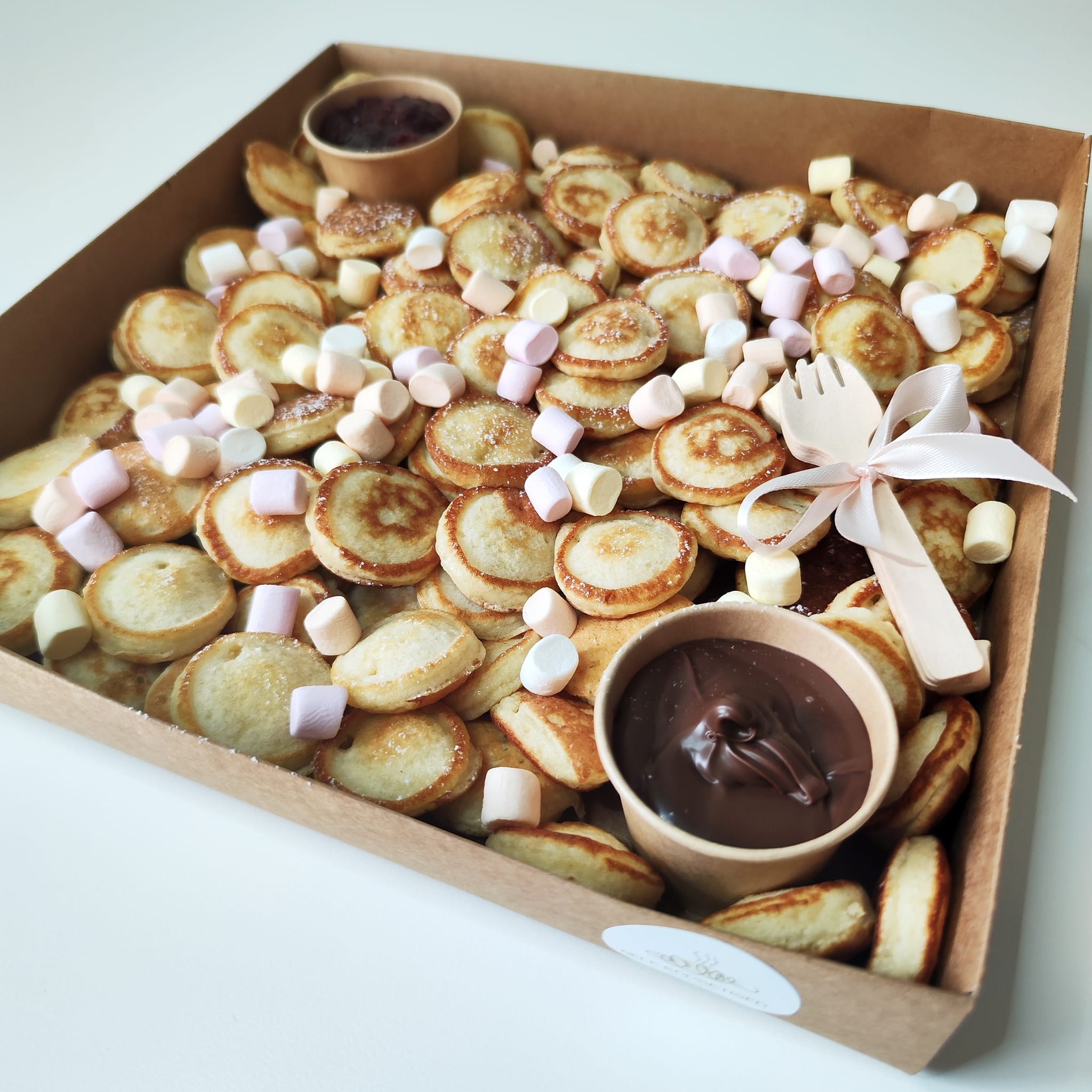 Komplekti kuulub 125 pannkooki ja 2 lisandit – šokolaad ja moos . Vaagnat kaunistavad minivahukommid ja lisaks on kaasas 7 puidust kahvlit.