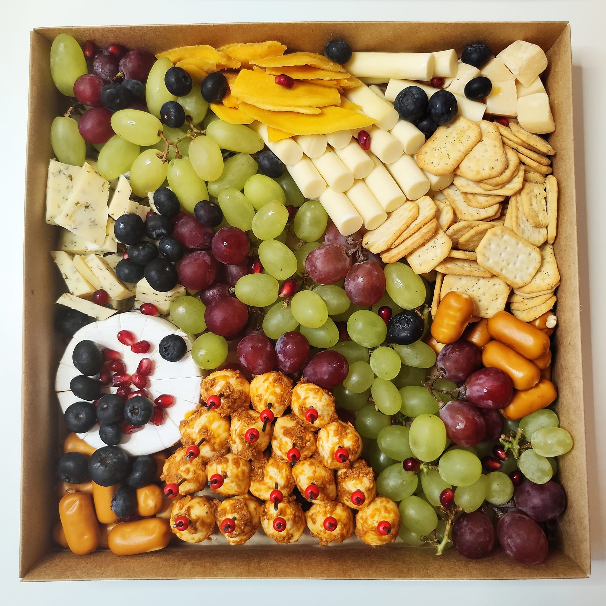 Lisaks juustudele on vaagnal ka viinamarju, magusaid kuivatatud mango viile, krõbedaid kreekereid ning mõni hooajaline mari/puuvili (nt viigimari).