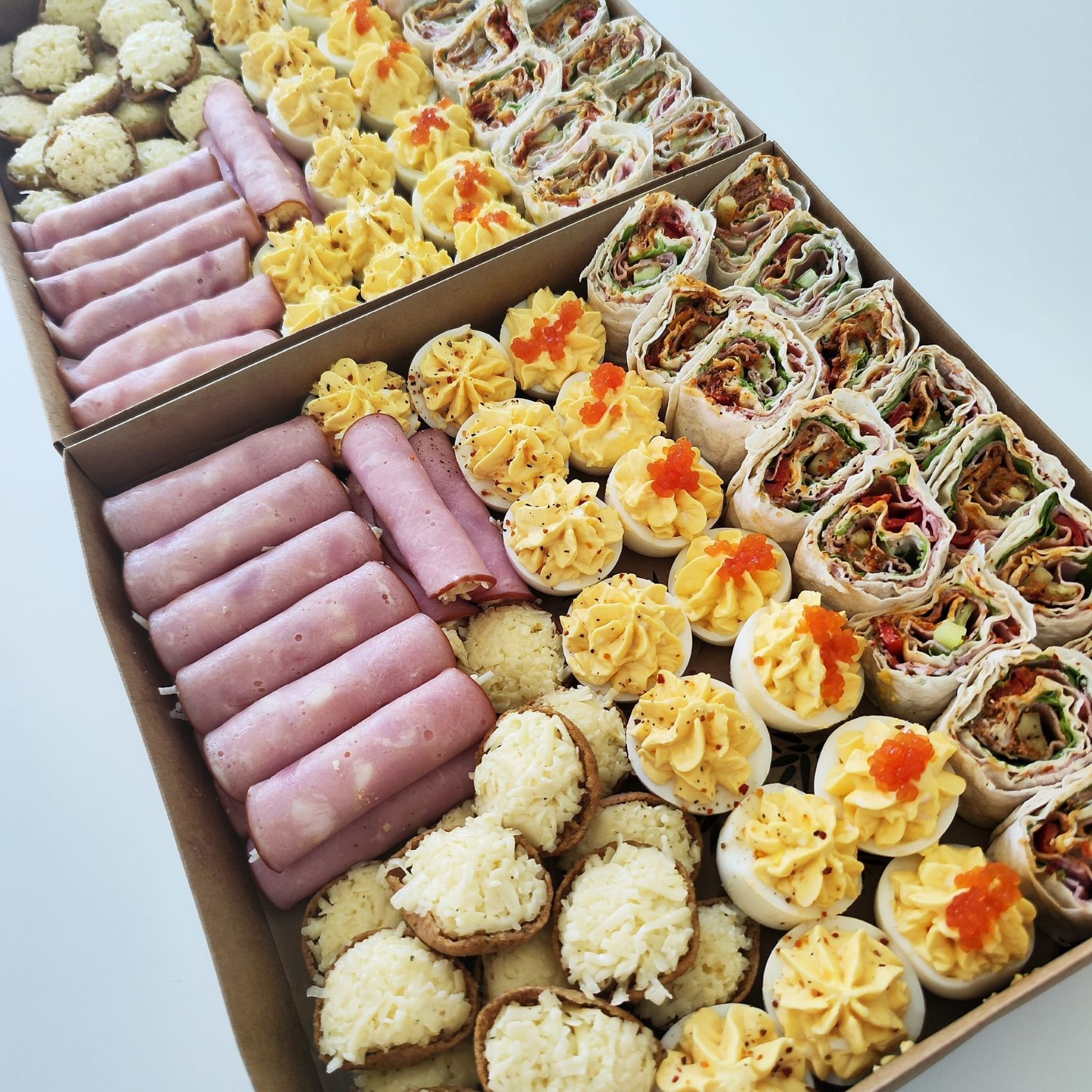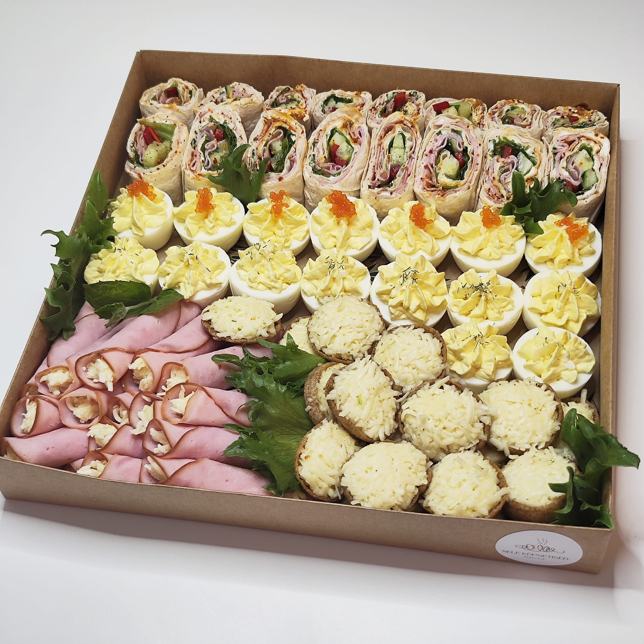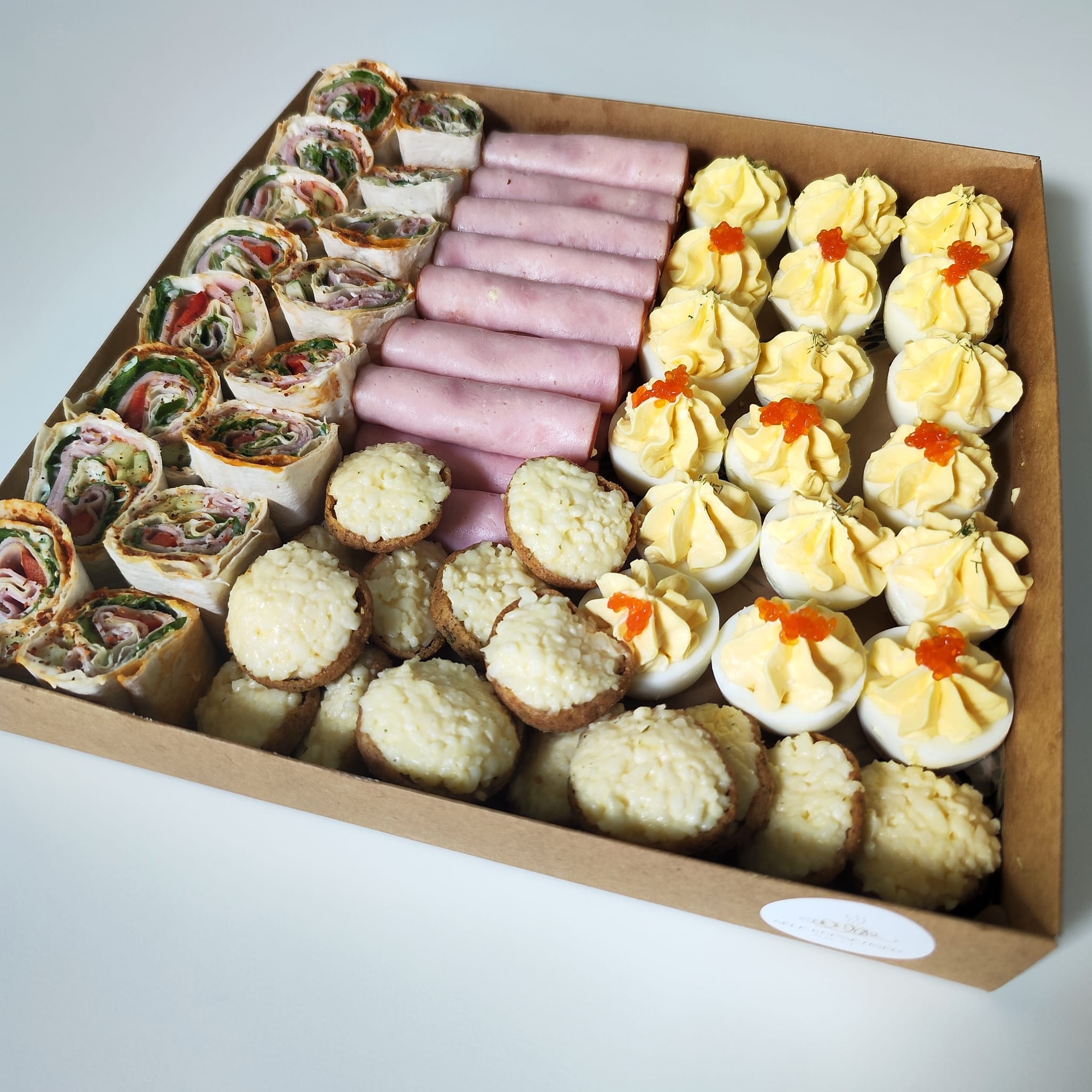Vaagnal on : lavaširullid singiga, singirullid, täidetud munad ja täidetud leivakorvikesed kerge küüslauguga.
